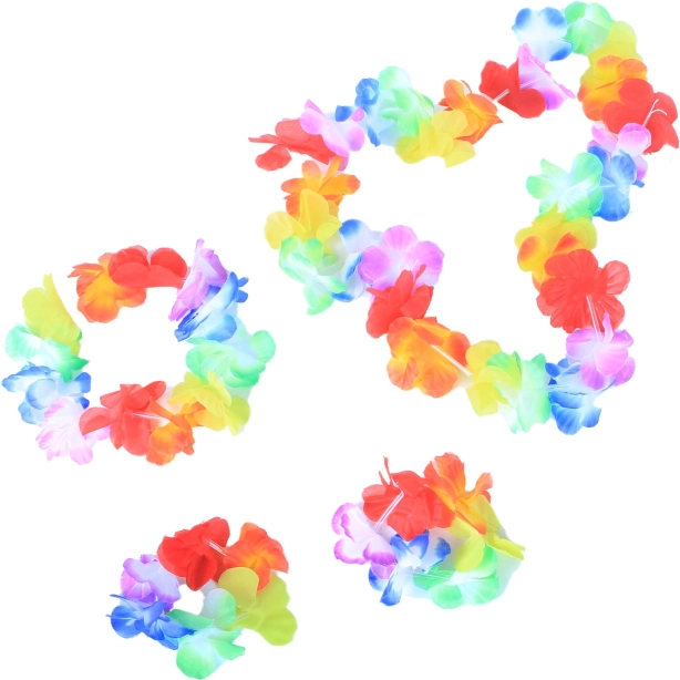 Wyrazisty zestaw karnawałowy w stylu „Hawaje” to świetny dodatek do kostiumu. Ten kolorowy komplet zawiera 2 bransoletki, 1 naszyjnik i 1 opaskę. Wszystko ozdobione jest płatkami kwiatów i piękną wiązanką. Rewelacja!