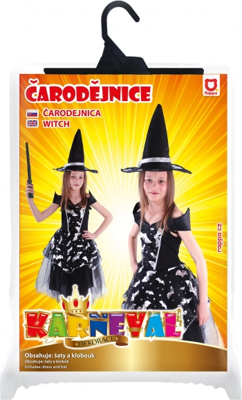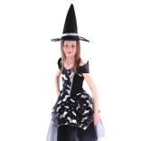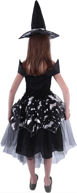 Ten czarujący kostium czarownicy to idealny wybór dla każdej małej damy, która chce przemienić się w stylową czarownicę! Kostium obejmuje czarną sukienkę z motywami nietoperzy, srebrnymi elementami i puszystą spódnicą, która dodaje odpowiedniej dawki elegancji i tajemniczości.