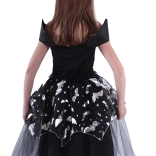 Kostium obejmuje czarną sukienkę z motywami nietoperzy, które nadają tajemniczy i elegancki wygląd.