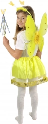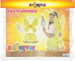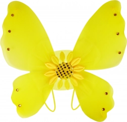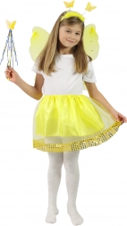 - Zawartość zestawu: skrzydła ze słonecznikiem i kamyczkami, puszysta spódniczka ze złotymi cekinami, opaska z motylkami, magiczna różdżka