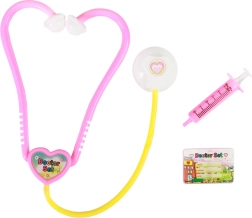 Kostium dla dzieci zawiera różowy stetoskop i żółtą strzykawkę, które wyglądają jak prawdziwe narzędzia medyczne.