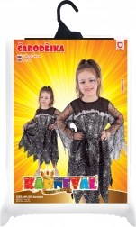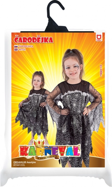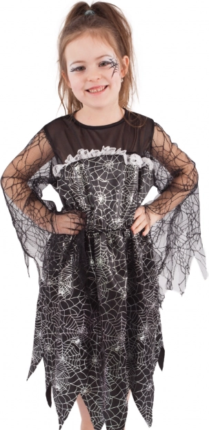 Odmień małą czarownicę w gwiazdę wieczoru. Elegancka czarna sukienka ze srebrnym nadrukiem pajęczyn, półprzezroczystymi siateczkowymi rękawami i efektownym postrzępionym brzegiem tworzy doskonale straszny, a jednocześnie uroczy wygląd na Halloween, karnawał i imprezy tematyczne.