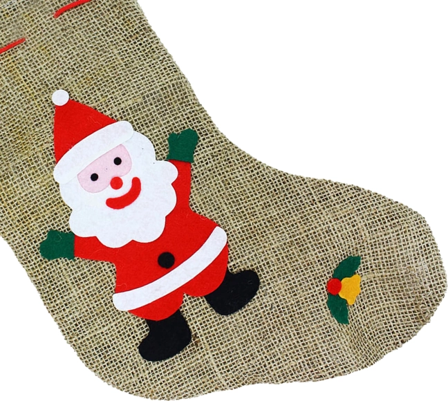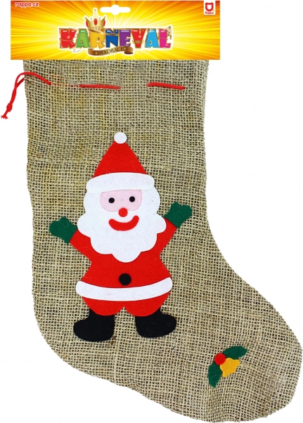 Tradycyjna mikołajkowa skarpeta z jutowej tkaniny workowej z praktyczną pętelką i ozdobnym nadrukiem. Do pojemnej skarpety zmieści się mnóstwo smakołyków i drobnych prezentów. Idealna na Mikołajki i Boże Narodzenie, bezpieczna dla dzieci od 3 lat, rozmiar 38 cm.