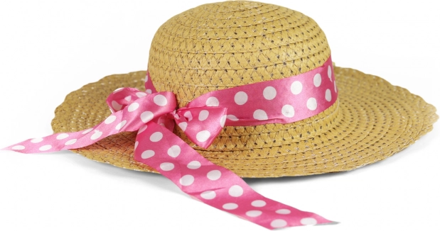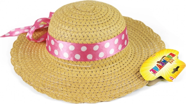 Piękny dziecięcy słomkowy kapelusz, idealny dla małych elegantek, ozdobiony różową wstążką w białe kropeczki.