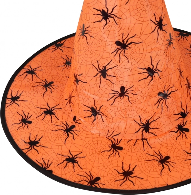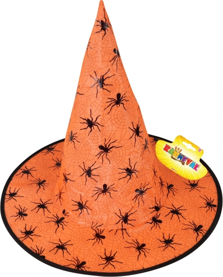Wejdź do świata magii z efektownym kapeluszem czarownicy w intensywnie pomarańczowym kolorze. Stożkowy kształt, szerokie rondo i kontrastowe czarne detale z motywami pajęczyn i pająków dodadzą Twojemu kostiumowi odpowiedniego, upiornego sznytu.