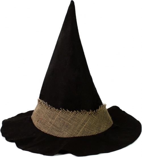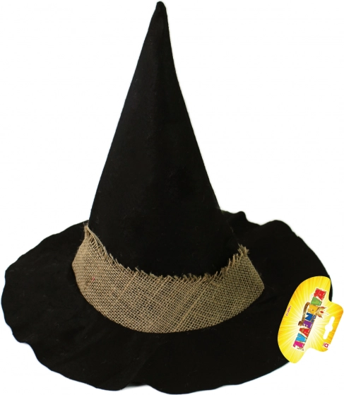Stylowy czarny czarodziejski kapelusz dla dorosłych z rustykalnym jutowym paskiem jest idealny na Halloween, karnawał i imprezy tematyczne. Lekki materiał tekstylny zapewnia wygodne noszenie, a charakterystyczny spiczasty kształt z szerokim rondem nadaje kostiumowi autentyczny wygląd.