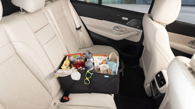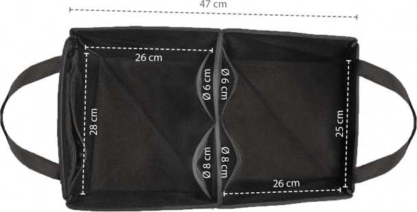 Organizer posiada kilka kieszeni na napoje lub butelki oraz inne drobiazgi, a także kieszeń na zamek błyskawiczny. Dwie duże komory zapewniają wystarczająco dużo miejsca do uporządkowanego przechowywania wszystkich niezbędnych rzeczy w podróży.