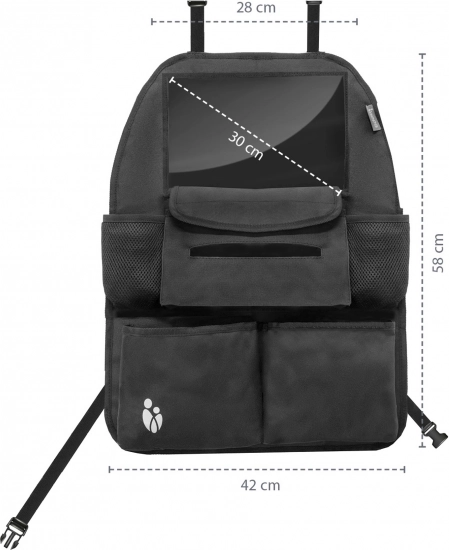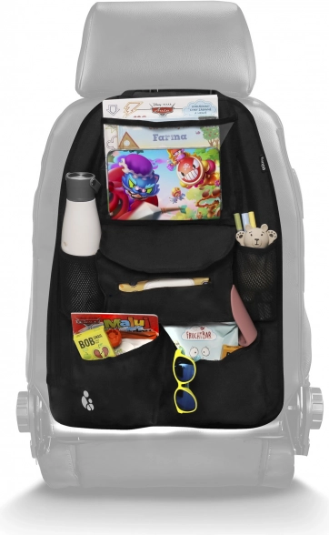 Uczyń podróż samochodem przyjemniejszą dzięki temu organizerowi zaprojektowanemu z myślą o maksymalnym komforcie i porządku. Zawiera ochronną kieszeń na tablet, kompatybilną z urządzeniami do 24 cm, która pozwala dzieciom oglądać ulubione bajki w trakcie jazdy.