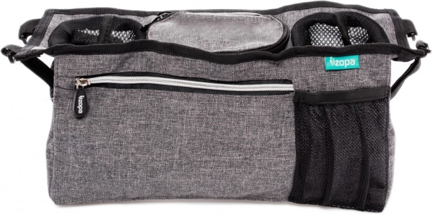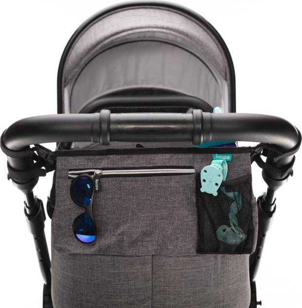 Praktyczny i przejrzysty organizer do wózka jest idealny na spacery z dzieckiem. Przednia część organizera zawiera dużą kieszeń na suwak na drobiazgi, które mama może potrzebować podczas wyjścia. Na przedniej stronie znajduje się także kieszonka z siateczki na telefon komórkowy, dzięki czemu mama zawsze widzi, gdy coś dzieje się z telefonem, mimo trybu cichego. Dziecka to nie obudzi. W środkowej części znajduje się duża kieszeń na suwak do przechowywania potrzebnych rzeczy. Po bokach ma dwa uchwyty na napoje.