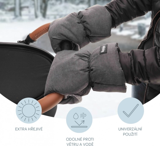 Uniwersalne zimowe rękawice do wózka utrzymają Twoje dłonie w cieple i suchości nawet w mroźną pogodę. Dzięki zapięciu na napy założysz je w mgnieniu oka. Pasują do wózków z połączoną rączką oraz do wózków typu parasolka, a ich materiał jest odporny na wiatr i wodoodporny. Wewnątrz znajduje się miękki polar dla dodatkowego komfortu i doskonałej izolacji cieplnej.
