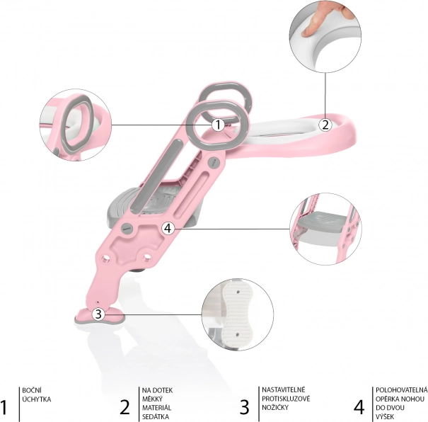 Schodki dzięki regulacji wysokości będą „rosły” razem z Twoim dzieckiem aż do czasu, gdy nie będą już potrzebne. Solidna konstrukcja gwarantuje, że dziecko będzie czuło się bezpiecznie zarówno podczas wchodzenia, jak i siedzenia. Nogi wyposażone są w specjalną antypoślizgową warstwę, która zapewnia poczucie stabilności i oparcia. W zestawie znajduje się również miękkie i wygodne siedzisko, które służy jako redukcja na klasyczną toaletę. Anatomiczny kształt siedziska wraz z podwyższonym tyłem doskonale zapobiega niechcianemu zabrudzeniu.