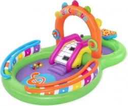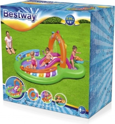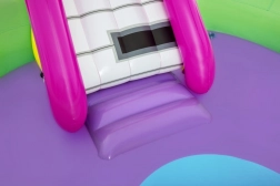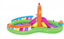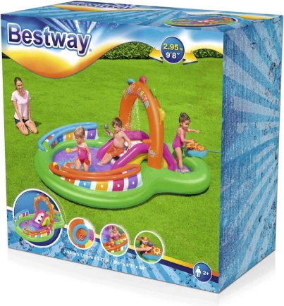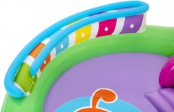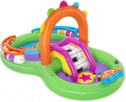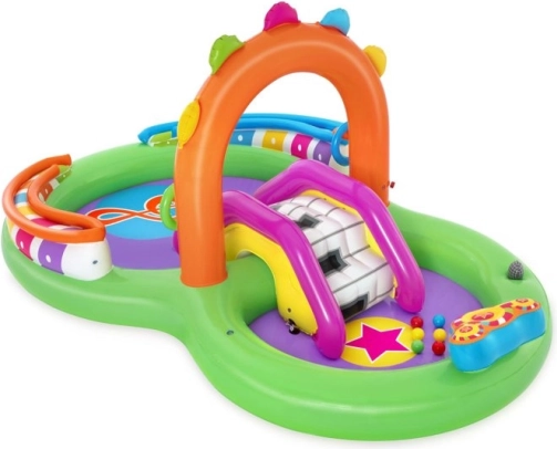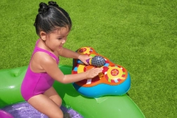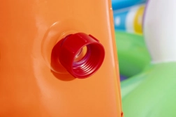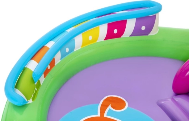 Odkrywaj i ciesz się wieloma zabawnymi funkcjami z nadmuchiwanym wodnym centrum zabaw Sing and Splash. Centrum zawiera mikrofon i bęben, którymi dzieci mogą się bawić, pobudzając wyobraźnię. Podwójne baseny są połączone odpinaną zjeżdżalnią przymocowaną linami i pętlami. W podłodze znajduje się wbudowana nadmuchiwana poduszka dla miękkiego lądowania po zjeździe. Łuk z wbudowanym zraszaczem wystarczy podłączyć do węża ogrodowego. Na kolce na łuku można rzucać nadmuchiwane kółka. W zestawie znajduje się 6 kolorowych piłeczek, które można spuszczać w dół po jednej i drugiej rampie. Te zabawy są nie tylko przyjemne, ale także rozwijają koordynację ręka-oko.