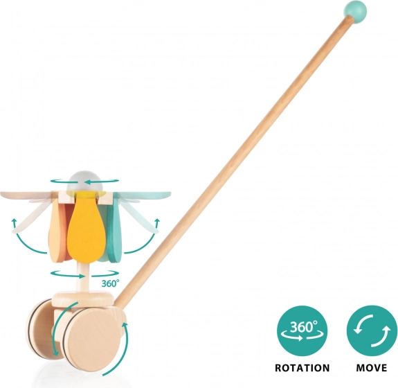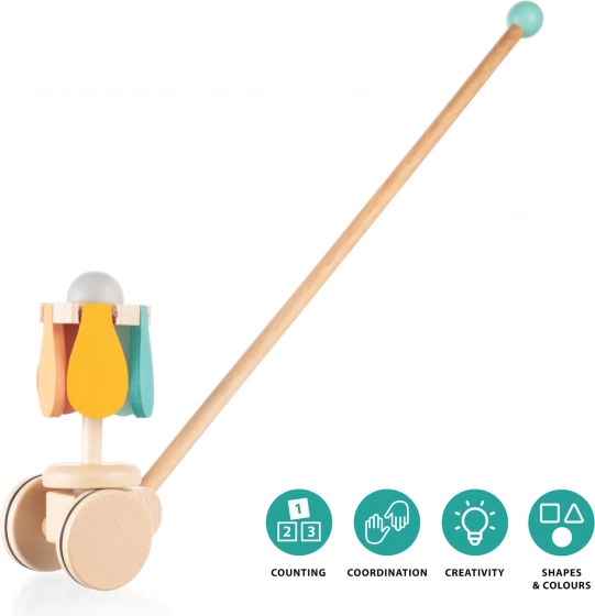 Drewniany jeździk kwiat to idealny towarzysz dla dzieci uczących się chodzić. Dzięki długiemu kijowi dzieciom wygodnie się nim manewruje, a obracający się kwiat utrzymuje uwagę i wspiera naturalny ruch. Wysokiej jakości drewniane wykonanie bez ostrych krawędzi gwarantuje bezpieczną zabawę w domu i na zewnątrz.