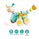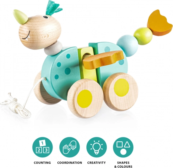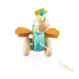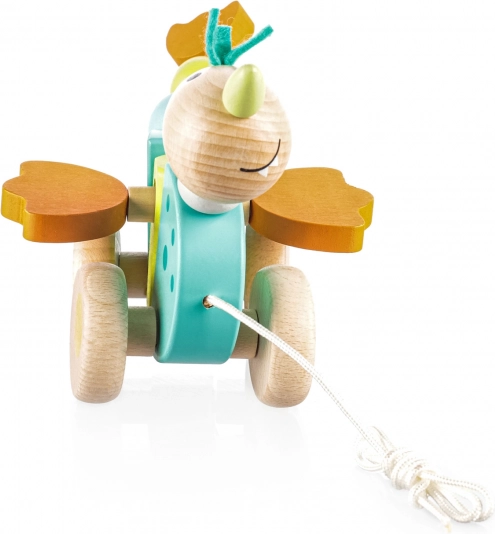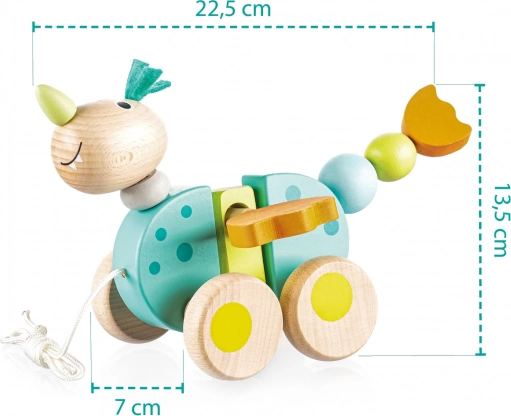 Ta drewniana zabawka do ciągnięcia w kształcie smoczka to świetny towarzysz dla małych odkrywców. Podczas chodzenia, dzięki prostemu mechanizmowi, trzepoczą skrzydła i ogon, co bawi dzieci i wspiera je w naturalnym ruchu. Wytrzymałe kółka umożliwiają radosną jazdę w domu i na zewnątrz.