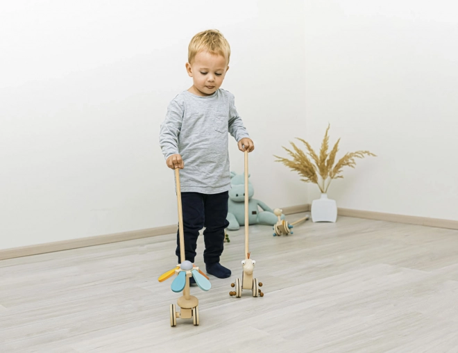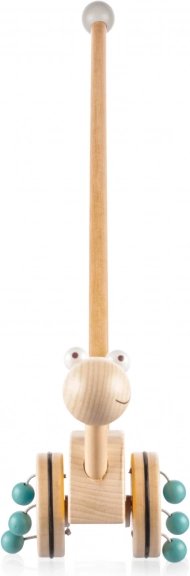 Solidna tyczka zapewnia wsparcie przy pierwszych krokach, z drewnianą kulą na końcu dla większego bezpieczeństwa. Jeździk wykonany jest z trwałego drewna bez ostrych krawędzi, co gwarantuje długą żywotność i bezpieczną zabawę.