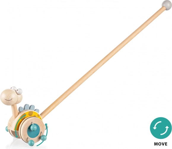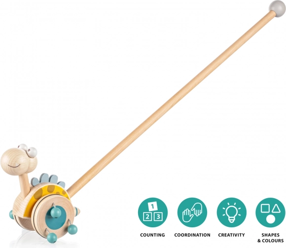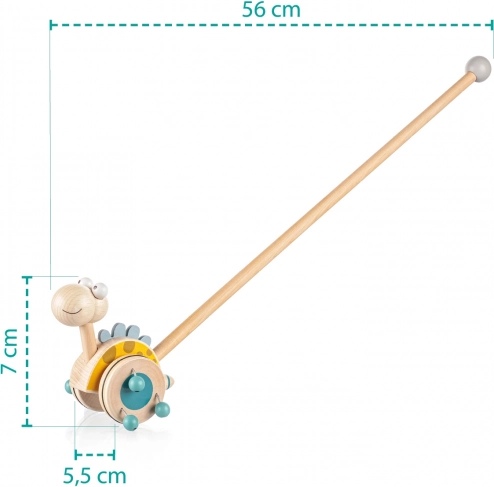 Jeździk na długiej tyczce to idealna zabawka dla dzieci, które zaczynają chodzić. Dinozaur na tyczce obraca się podczas ruchu, a dzięki drewnianym koralikom na kółkach wydaje dźwięk, który przyciąga uwagę dziecka i zachęca do chodzenia.