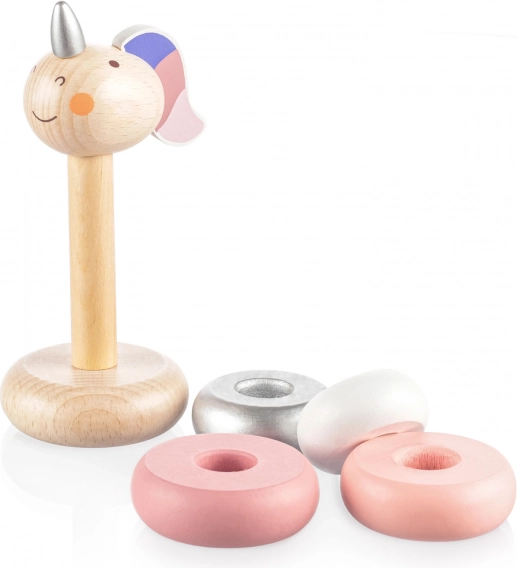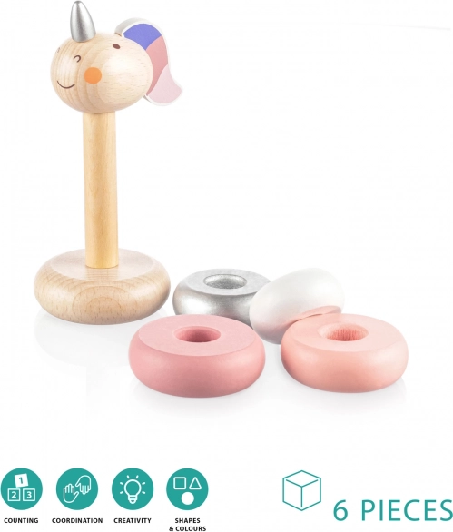 Design w kształcie Jednorożca jest atrakcyjny dla najmłodszych, a dzięki zestawowi z różnymi rozmiarami pierścieni dziecko łatwo nauczy się podstawowego liczenia i rozpoznawania wielkości. Wysokiej jakości i trwałe wykonanie z użyciem farb na bazie wody zapewnia bezpieczną zabawę.