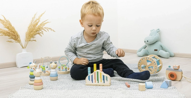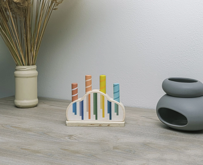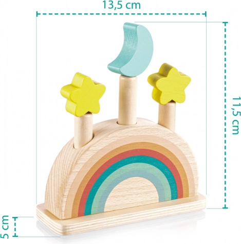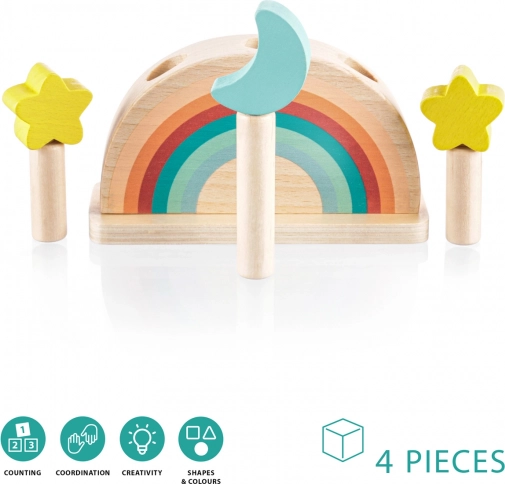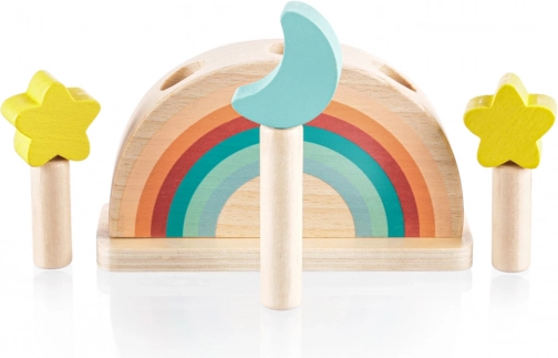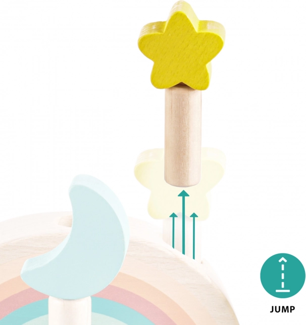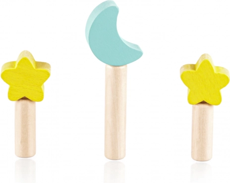 Zajmij swoje dziecko na długie godziny tą interaktywną drewnianą zabawką. Idealna dla ciekawskich dzieci, które lubią odkrywać nowe rzeczy i uczyć się poprzez zabawę. Trzy kolorowe kołeczki z motywem księżyca i gwiazd są solidnie osadzone w drewnianej podstawie ze sprężynami. Delikatne naciśnięcie zwalnia kołeczki i sprawia, że wyskakują – to nie tylko fascynujące dla dziecka, ale również rozwijające jego motorykę.