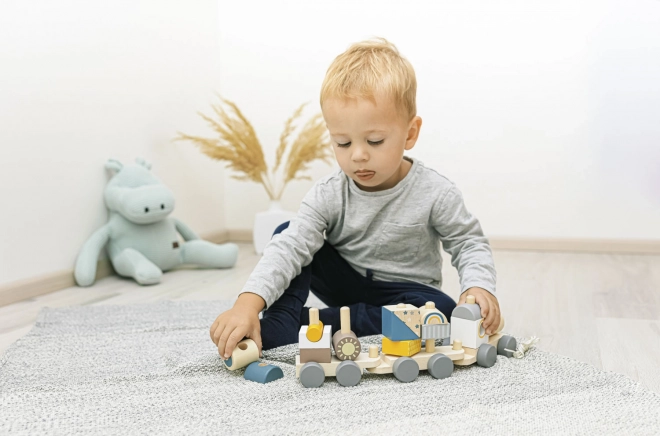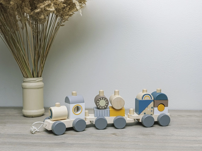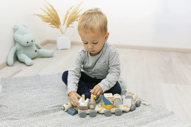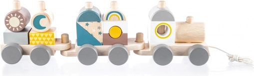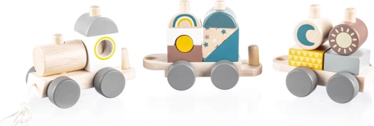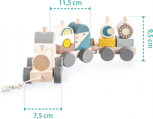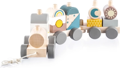 Kolorowa drewniana lokomotywa dla dzieci, która wspiera ich umiejętności motoryczne. Ten interaktywny i edukacyjny pociąg umożliwia układanie i ciągnięcie, co motywuje dzieci do chodzenia i rozwija ich kreatywność.