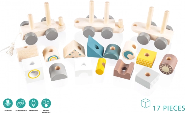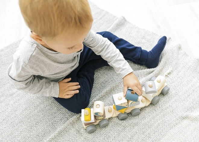 Zabawka składa się z 14 kolorowych elementów, które można łatwo łączyć i układać w różne kształty i formy. Po zakończeniu układania pociąg można ciągnąć za pomocą praktycznego sznureczka, co dodaje kolejny poziom zabawy.