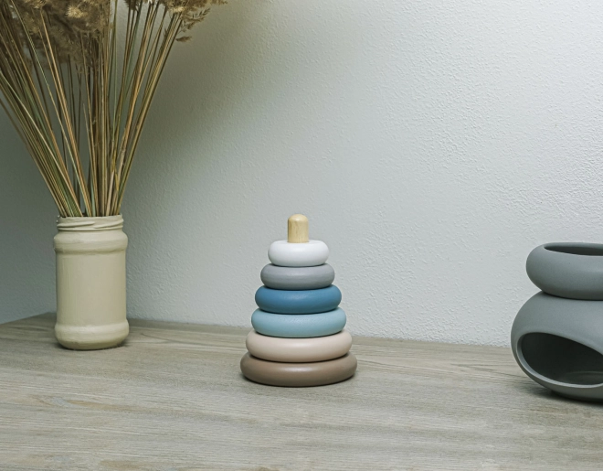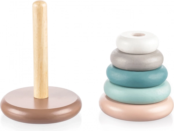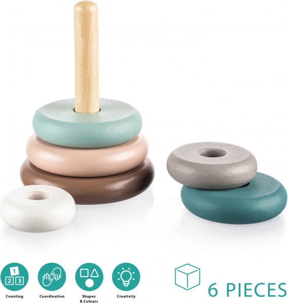 Drewniane nakładane kółka zapewniają nieskończone możliwości zabawy dla małych odkrywców. Dzięki temu zestawowi, zawierającemu 6 elementów o różnych rozmiarach, można układać i przekształcać wiele różnych kombinacji. Zabawka wspiera takie umiejętności jak sortowanie, układanie oraz rozpoznawanie kolorów i rozmiarów.