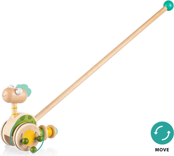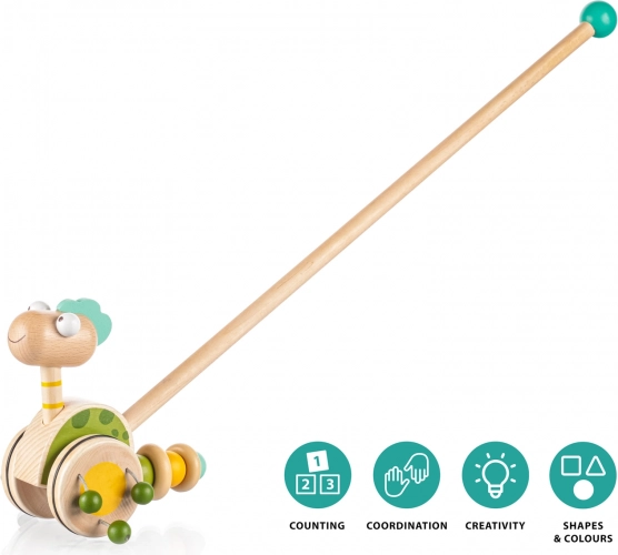 Jeździk na kiju to idealna zabawka dla dzieci, które zaczynają chodzić. Zabawny dinozaur na długim kiju obraca się podczas ruchu, a dzięki drewnianym koralikom przymocowanym do kółek wydaje dźwięk, który zachęca dziecko do chodzenia i zapewnia rozrywkę na długie godziny.
