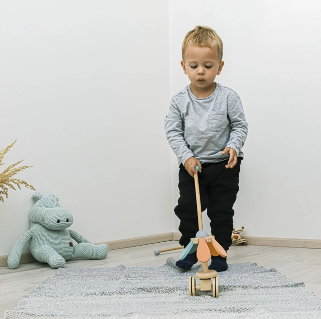 Solidny kij dodatkowo służy jako podparcie przy pierwszych krokach dziecka i jest zakończony drewnianą kulą dla większego bezpieczeństwa. Jeździk nie ma ostrych krawędzi i jest wykonany z wytrzymałego drewna o długiej żywotności.