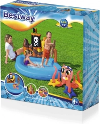 Zamień ogród w małe wodne królestwo. Ten nadmuchiwany piracki plac zabaw BESTWAY oferuje niebieski basenik z dekoracją statku, obrotowym kołem sterowym, rzucanymi kółkami/gwiazdami i wesołą ośmiornicą. Wykonany z wytrzymałego PVC, łatwy w rozstawieniu i idealny do bezpiecznej wodnej zabawy dla najmłodszych.