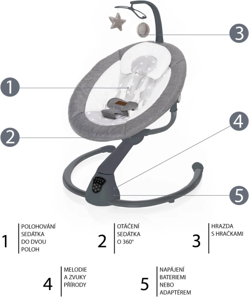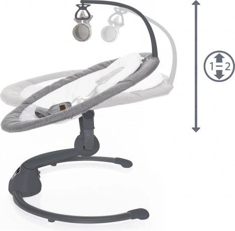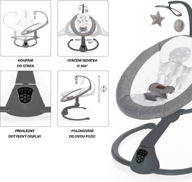 Sterowanie jest intuicyjne dzięki czytelnemu panelowi dotykowemu lub dołączonemu pilotowi. Miękkie, bogato wyściełane siedzisko z dwiema pozycjami oraz bezpieczne 5‑punktowe pasy gwarantują wygodę także podczas dłuższego odpoczynku. W zestawie znajduje się pałąk z dwiema odpinanymi pluszowymi zabawkami oraz kojące melodie i odgłosy natury z regulacją głośności.