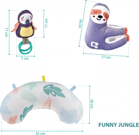Odkryj zabawną i rozwojową matę edukacyjną Funny Jungle z miękką podkładką, pałąkiem i zawieszkami. Wspiera rozwój psychomotoryczny, stymuluje wzrok kontrastowymi kolorami oraz oferuje kojące melodie dla Twojego maluszka. W zestawie znajduje się poduszka wspierająca do leżenia na brzuszku oraz 20 kolorowych piłeczek dla jeszcze większej zabawy.
