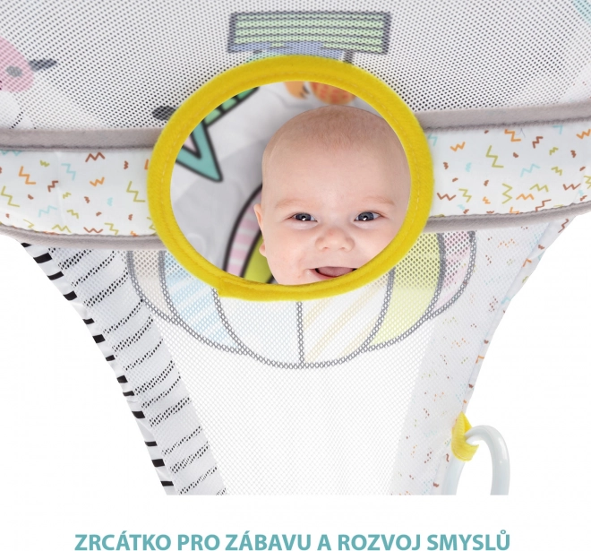 - Zabawa i stymulacja: zawieszki, melodia i kontrastowe wzory dla bodźców wzrokowych i słuchowych.
