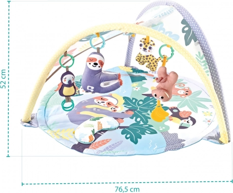 Mata edukacyjna Funny Jungle tworzy bezpieczne i stymulujące środowisko do codziennej zabawy i odpoczynku. Zawieszki zachęcają dziecko do sięgania, chwytania i poruszania, co naturalnie wzmacnia mięśnie i koordynację. Jedna z zabawek odtwarza przyjemną melodię, która pomaga maluszka wyciszyć i zainteresować.