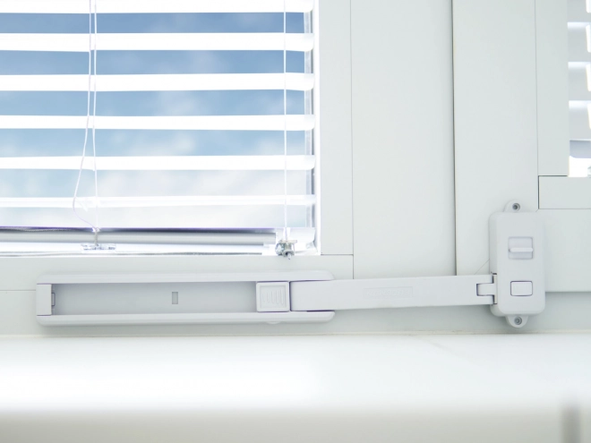 Bezpieczne wietrzenie z zamkiem zabezpieczającym do okien i drzwi przesuwnych. Chroni przed niepożądanym otwarciem i zapewnia bezpieczne poruszanie się dzieci w pomieszczeniu. Szybki montaż za pomocą taśmy samoprzylepnej.