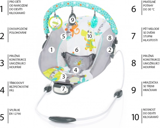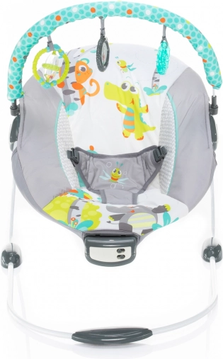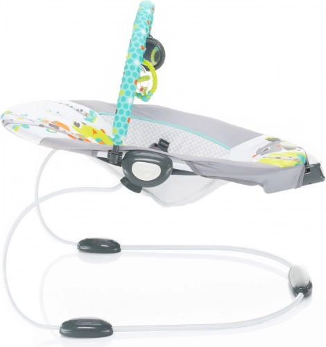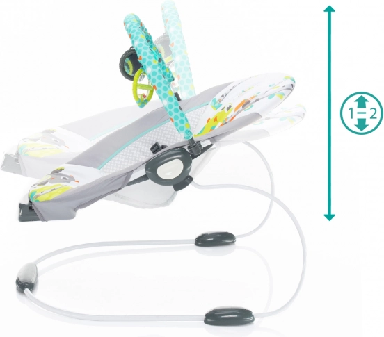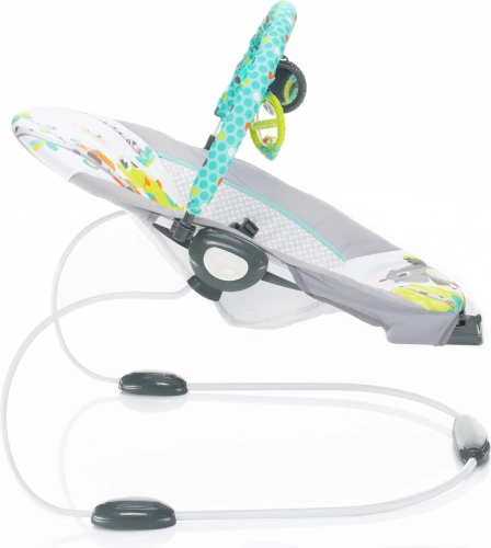 Leżaczek Happy zaoferuje Twojemu maluszkowi wiele nowych bodźców, dlatego z pewnością go polubi. Jego głównym atutem jest sprężysta konstrukcja, dzięki której dziecko może samo „rozkołysać” leżaczek swoimi ruchami. 3‑punktowe pasy bezpieczeństwa oraz antypoślizgowe nóżki zadbają o bezpieczeństwo. Uwagę dziecka przyciągnie także urocza pałąk z 3 zmywalnymi zabawkami, które rozwijają zmysły i małą motorykę. 2‑stopniowa regulacja oparcia zapewni wygodne siedzenie i najlepszy widok.