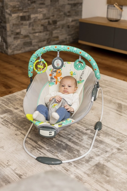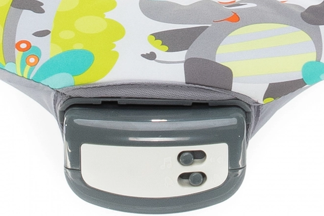 Leżaczek Happy posiada mechanizm grający z 5 melodiami i 2 poziomami głośności. Dla ukojenia maluszka wyposażono go także w tryb przyjemnych wibracji. Wibracje leżaczka i melodie można włączać niezależnie od siebie.