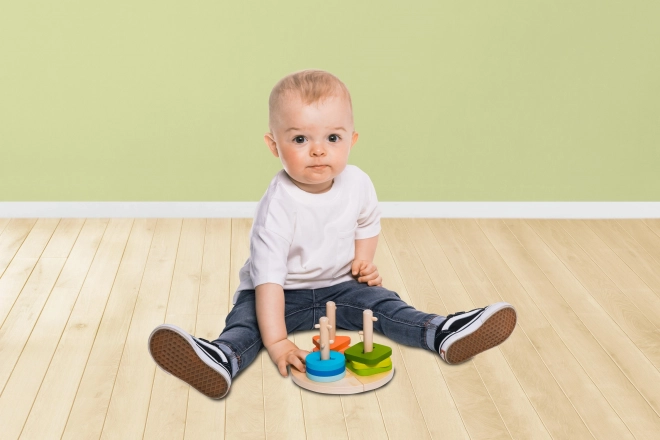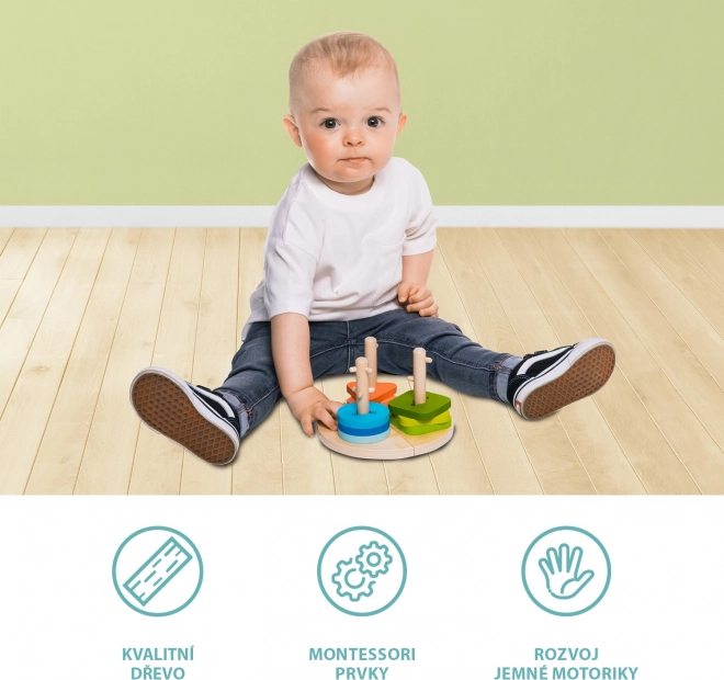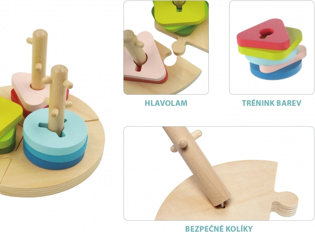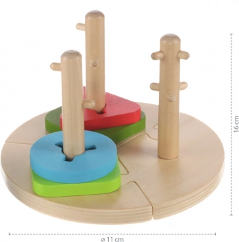 Kolorowa układanka na okrągłej podstawie z 3 części. Każda część zawiera drewniany pręt z wypustkami, na który można nakładać drewniane, kolorowe kształty. Zabawka rozwija koordynację, wyobraźnię przestrzenną i sprawność manualną. Dzięki dużej liczbie możliwości układania pobudza także dziecięcy umysł i wspiera kreatywne myślenie. Puzzle są wykonane z wysokiej jakości drewna i farb na bazie wody.
