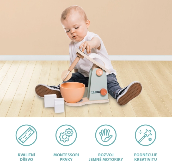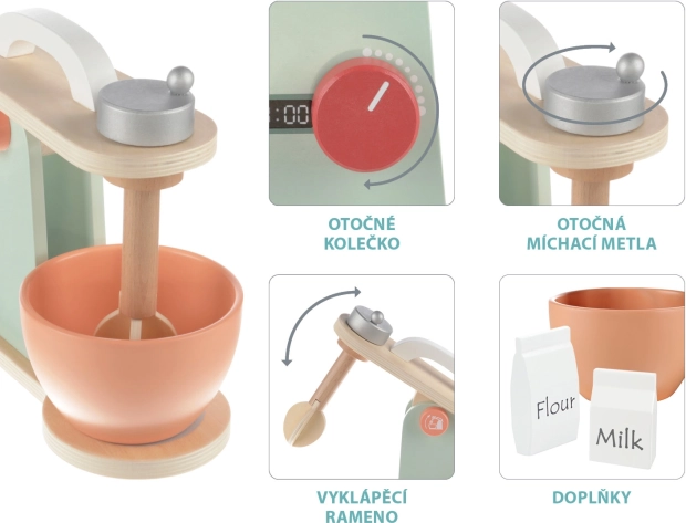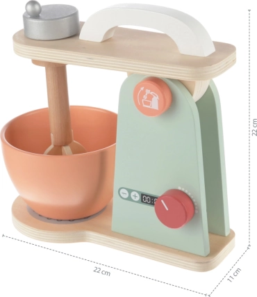 Dopracowany mikser dla wszystkich dzieci, które chcą piec najsmaczniejsze wypieki. Mikser ma kilka przycisków, które można obracać lub naciskać. W zestawie znajduje się misa, w której robot kuchenny miesza ciasto. Zabawka wykonana jest z wysokiej jakości drewna i farb na bazie wody.