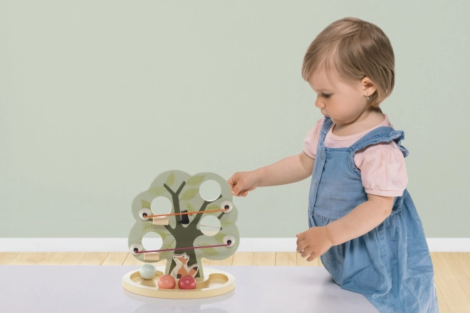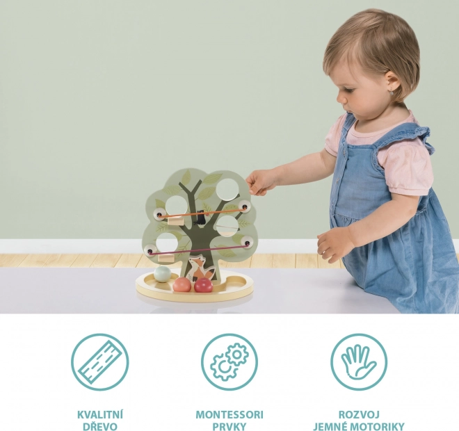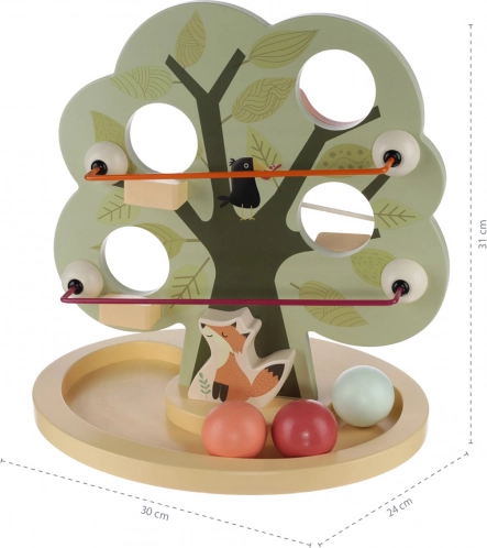 Urocza drewniana zabawka w kształcie drzewa ma kilka otworów do przewlekania kulek. Rynienka na dole zatrzymuje kulki, dzięki czemu dziecko może obserwować, jak spadają. Zabawka rozwija wyobraźnię, myślenie i koordynację rąk.