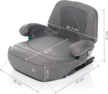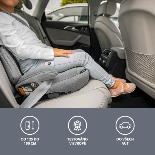 Podparcie lędźwiowe i podłokietniki dbają o to, by dziecko czuło się komfortowo podczas jazdy. Cały fotelik pokryty jest miękką wyściółką i tapicerką. Podstawka jest przeznaczona dla dzieci od 125 cm wzrostu i może być używana aż do 150 cm (do 12 lat), czyli tak długo, jak wymagane jest przewożenie dziecka w foteliku.