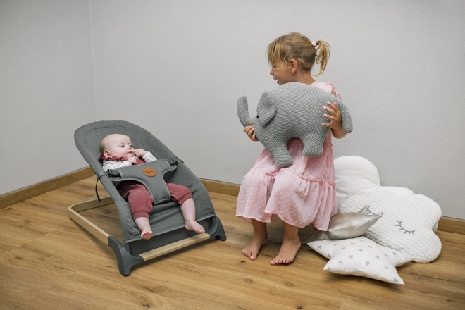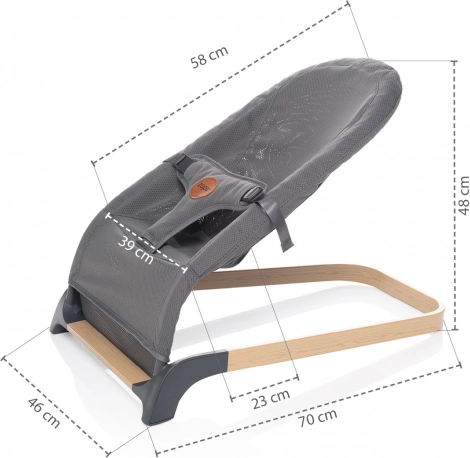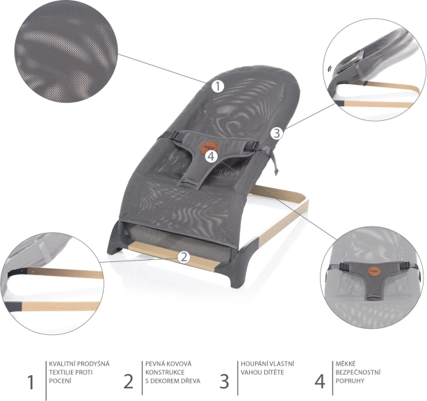 Leżaczek jest lekki i łatwy do przenoszenia. Dzięki nowoczesnemu wzornictwu z dekorem drewna łatwo wpasuje się w każde wnętrze. Montaż jest bardzo prosty. Leżaczek spełnia normę bezpieczeństwa EN 12790.