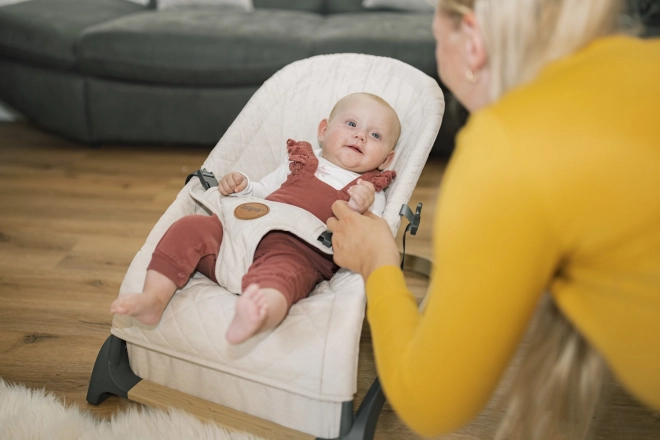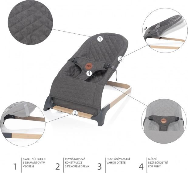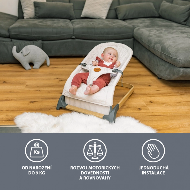 Leżaczek jest lekki i łatwy do przenoszenia. Dzięki nowoczesnemu wzornictwu z drewnianym dekorem z łatwością wpasuje się w każde wnętrze. Montaż jest bardzo prosty. Leżaczek spełnia normę bezpieczeństwa EN 12790.