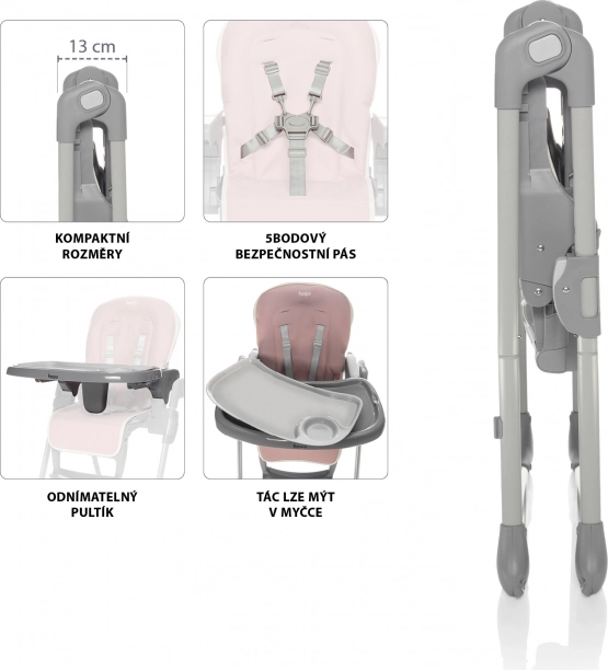 Krzesełko można łatwo ustawić tak, aby siedzenie było jak najbardziej wygodne. Regulowane oparcie można ustawić w 3 pozycjach. Oczywistością jest regulacja wysokości w 6 różnych poziomach. Możliwa jest także regulacja podnóżka. W wyjmowany blat wstawiono tackę, którą można wysunąć oddzielnie. Tapicerka krzesełka jest zmywalna i w razie zabrudzenia wystarczy przetrzeć ją wilgotną ściereczką. Dla maksymalnego bezpieczeństwa dziecka krzesełko wyposażono w 5‑punktowe pasy bezpieczeństwa.