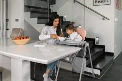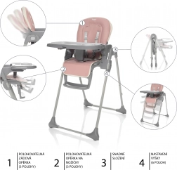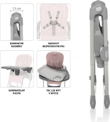 Kompaktowe dziecięce krzesełko do karmienia z lekką, ale stabilną konstrukcją oferuje szybkie składanie do szerokości zaledwie 13 cm, 6 poziomów wysokości, 3 pozycje oparcia pleców oraz regulowany podnóżek. Odłączana tacka z wkładanym talerzykiem odpowiednim do zmywarki, zmywalna tapicerka i 5-punktowe pasy bezpieczeństwa zapewniają wygodę i bezpieczeństwo przy każdym karmieniu.