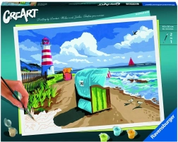 CreArt (Premium Series B) – wakacje nad Bałtykiem to idealny wybór dla młodych i początkujących artystów, którzy chcą odkrywać piękno nadmorskiego krajobrazu. Dzięki nadrukowanym polom i ponumerowanym farbom łatwo zanurzysz się w tworzeniu i krok po kroku stworzysz efektowny obraz morskiego wybrzeża.