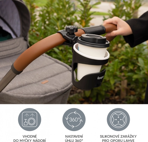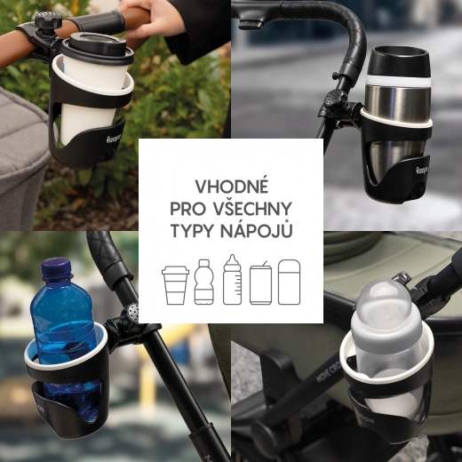 Ciesz się spacerami lub jazdą na rowerze z wolnymi rękami – uniwersalny uchwyt na napoje bezpiecznie pomieści kawę, kubek podróżny i butelkę dla dziecka. Obrotowy przegub pozwala ustawić idealny kąt, by napój się nie wylewał, a solidna obejma z antypoślizgową wkładką trzyma się rączki wózka lub kierownicy pewnie i bez chybotania.