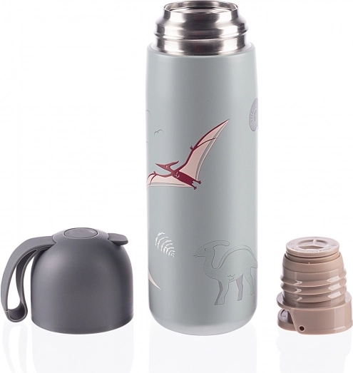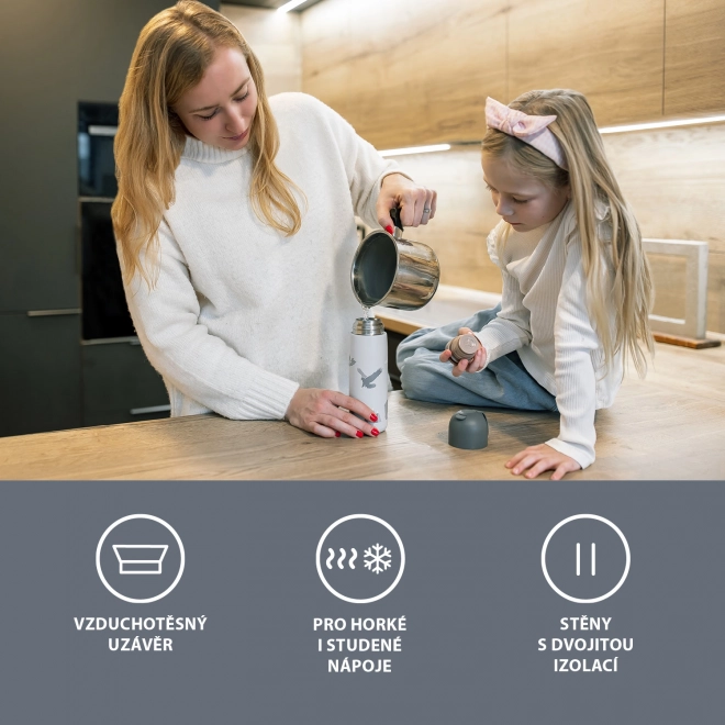 Wysokiej jakości termos na płyny o pojemności 400 ml utrzymuje gorące napoje do 12 godzin, a zimne nawet do 24 godzin. Wykonany jest z wysokiej jakości stali nierdzewnej odpornej na korozję. Szczelna pokrywka zapobiega przeciekaniu, a górny korek do wygodnego nalewania sprawia, że nie oblejesz się nawet podczas jazdy samochodem po nierównej drodze; możesz też mieć pewność, że dziecko nie poparzy się napojem dzięki podwójnemu zamknięciu. Pokrywkę termosu można używać jako kubek.