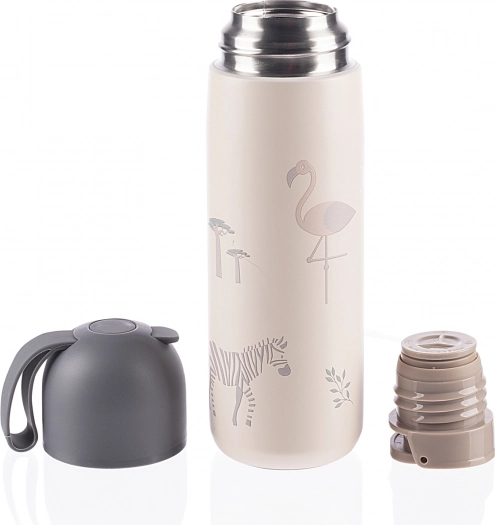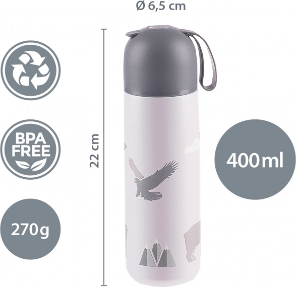 Wysokiej jakości termos na napoje o pojemności 400 ml utrzymuje gorące napoje do 12 godzin, a zimne aż do 24 godzin. Wykonany jest z wysokiej jakości stali nierdzewnej odpornej na korozję. Szczelna pokrywka zapobiega przeciekaniu, a górny korek do wygodnego nalewania sprawia, że nie oblejesz się nawet podczas jazdy samochodem po nierównej drodze; możesz też mieć pewność, że dziecko nie poparzy się napojem z termosu dzięki podwójnemu zamknięciu. Pokrywkę termosu można używać jako kubek.