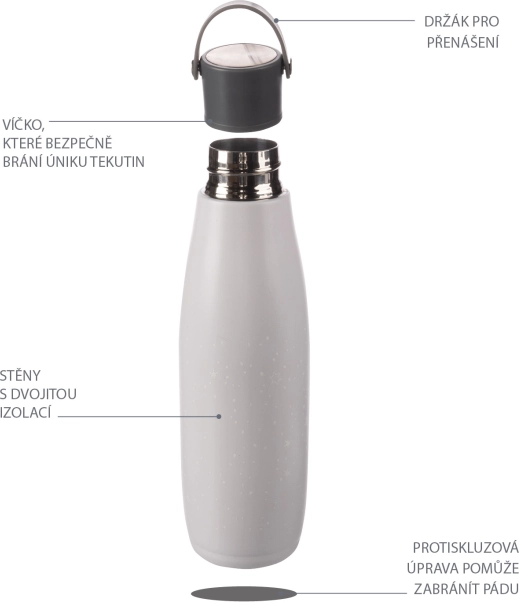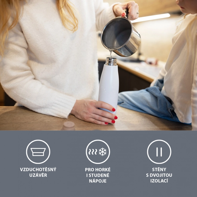 Wysokiej jakości termos na napoje o pojemności 480 ml utrzymuje ciepłe napoje do 12 godzin, a zimne nawet do 24 godzin. Wykonany jest z wysokiej jakości stali nierdzewnej odpornej na korozję. Szczelna zakrętka zapobiega przeciekaniu. Dzięki izolacji próżniowej termos nie nagrzewa się z zewnątrz po napełnieniu gorącym napojem. Dla wygodnego chwytu termos wyposażony jest w uchwyt.