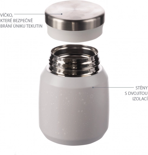 Wysokiej jakości termos na jedzenie i przetwory o pojemności 300 ml utrzymuje gorące potrawy do 12 godzin, a zimne do 24 godzin. Wykonany jest z wysokiej jakości stali nierdzewnej odpornej na korozję. Szczelna pokrywka zapewnia, że termos nie przecieka. Dzięki izolacji próżniowej termos po napełnieniu gorącą zawartością nie nagrzewa się z zewnątrz.