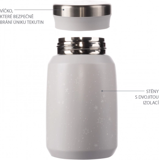 Wysokiej jakości termos na jedzenie i przetarte pokarmy o pojemności 500 ml utrzymuje gorące potrawy do 12 godzin, a zimne do 24 godzin. Wykonany jest z wysokiej jakości stali nierdzewnej odpornej na korozję. Szczelna zakrętka zapewnia, że termos nie przecieka. Dzięki izolacji próżniowej termos po napełnieniu gorącą zawartością nie nagrzewa się z zewnątrz.